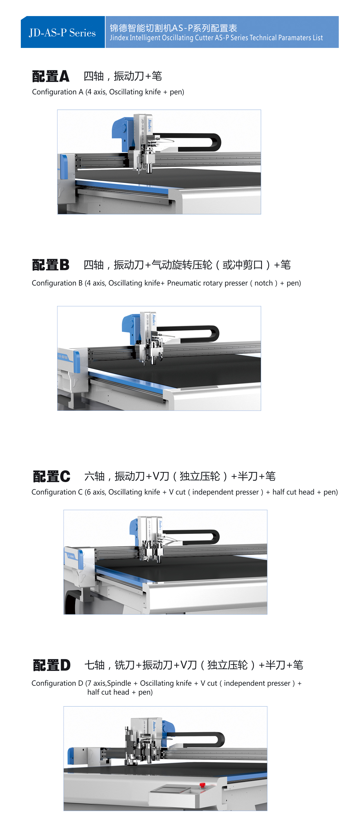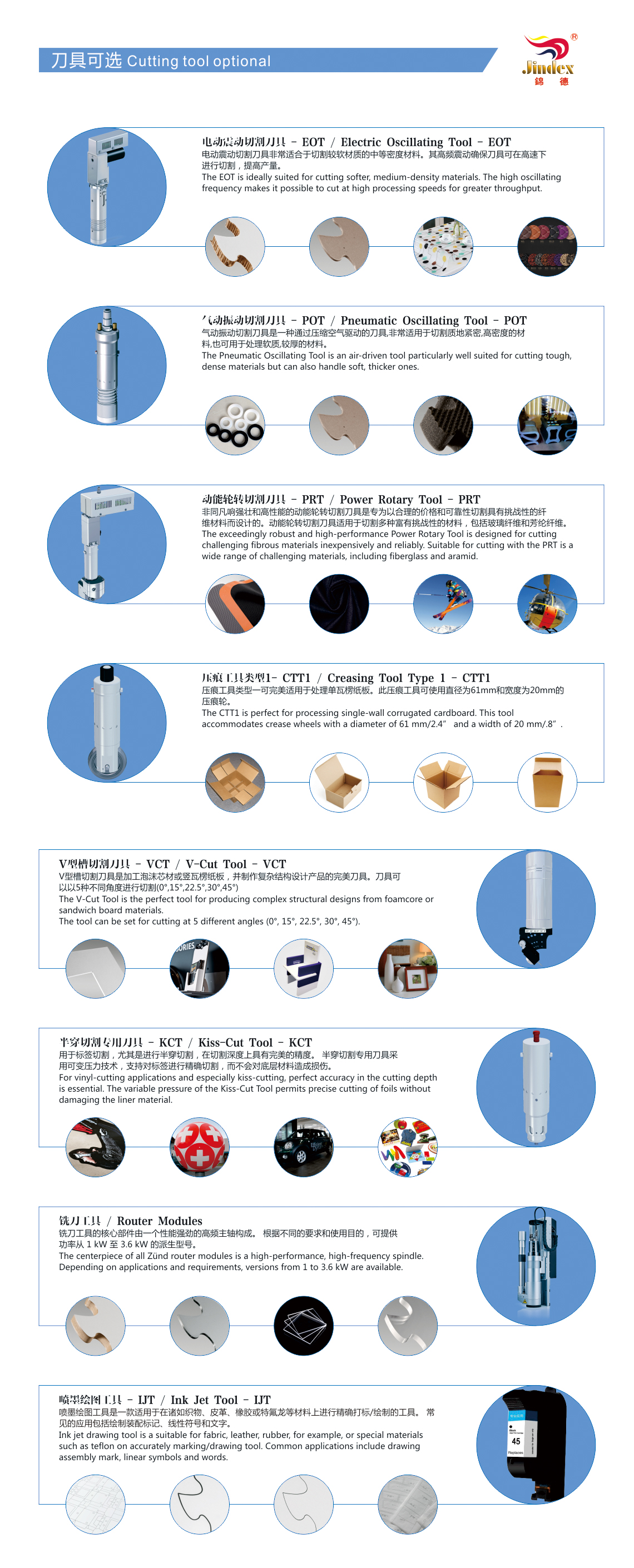 ◇ 配置振动刀、拖刀,笔画工具以及可选配置半刀,铣刀,开槽刀,圆刀、压痕刀等多种刀具,可实现写字画线、虚线裁切、半断裁切、全断裁切、铣刀裁切、多种材料V-CUT开槽、开铣槽、大小压轮压痕、硬质材料刮痕等实用功能。