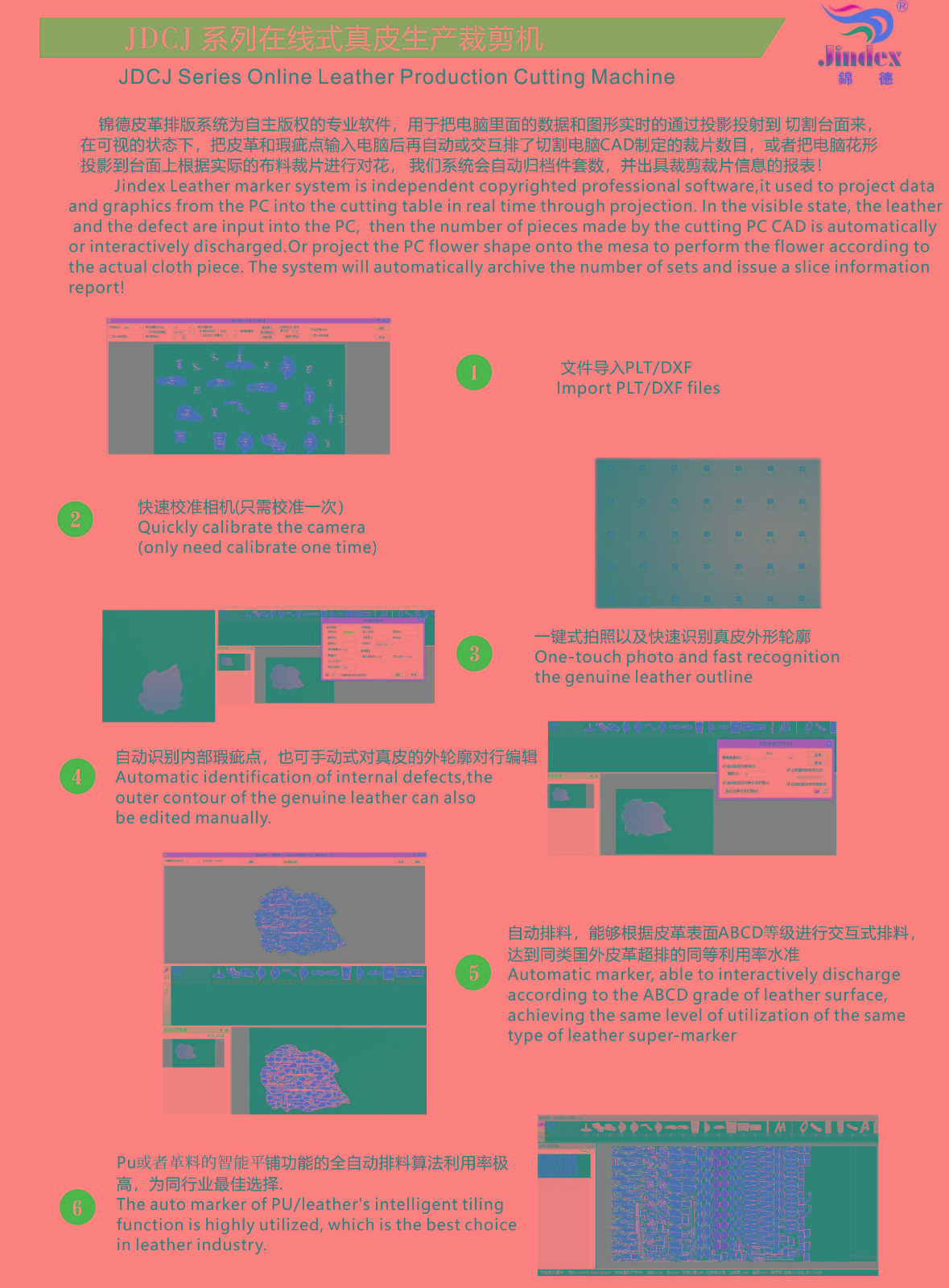 适用行业:真皮座椅、真皮座套、真皮沙发、真皮箱包鞋业、真皮按摩椅等: 锦德全自动真皮裁剪流水线系统采用最先进的高清全彩真皮轮廓采集系统,通过高精度扫描提取真皮不规则轮廓形状、面积、瑕疵等信息,配合全自动排料系统,产生最优化的裁剪方案,独特的三段式流水工作平台,可以发挥最大裁剪效能,减少劳动强度,提升综合使用能效,裁剪效能较传统真皮裁剪设备提升120%以上。
