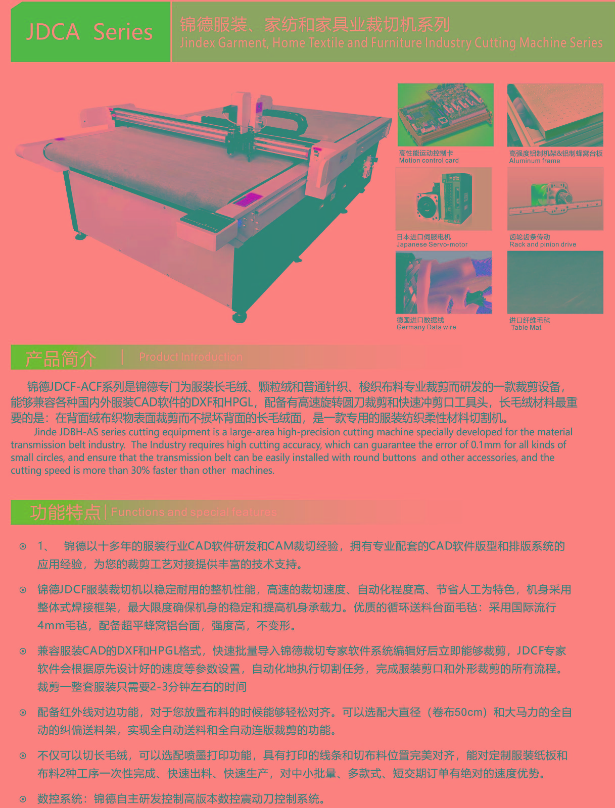 1.智能制版排版软件,支持制版、一键超级排料 2.刀具互换系统,适用更多材料切割 3.整机防静电系统,保护人员安全 4.自主研发系统,普工2小时熟练上岗