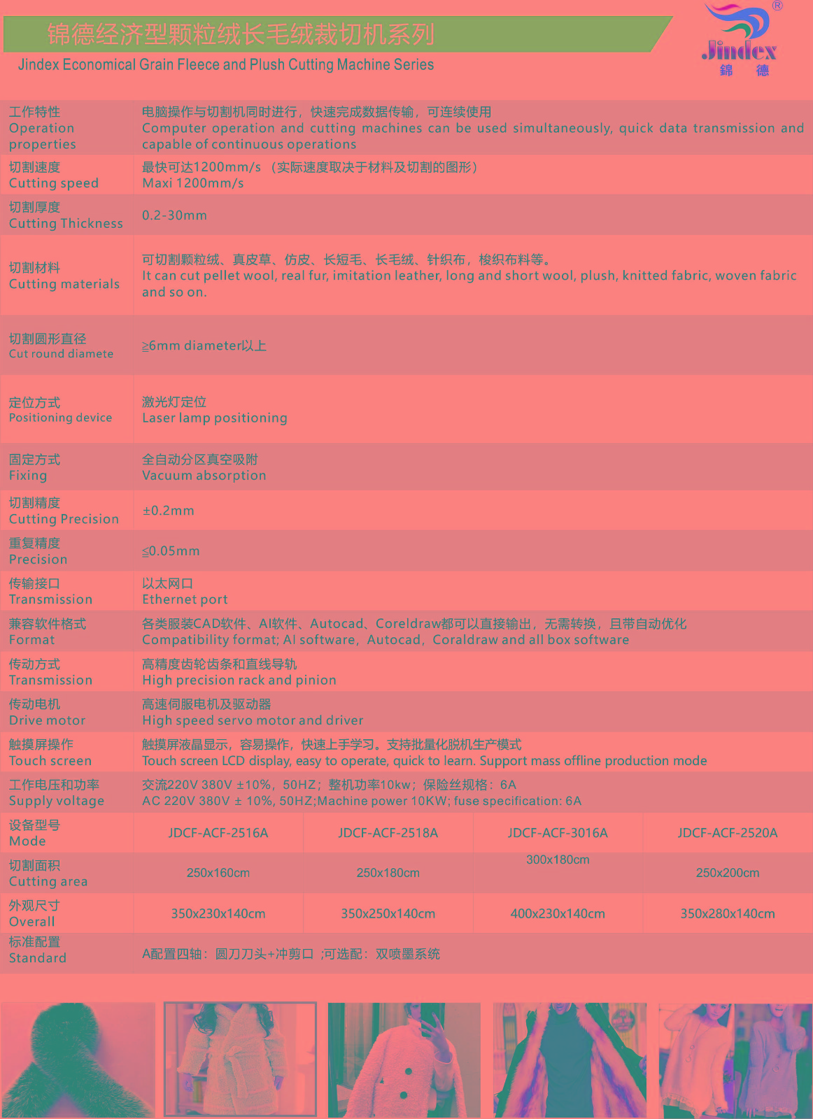 适用行业:皮草、颗粒绒、皮毛一体、皮革等材料 1.独有技术 长短毛裁剪不伤毛 不缠毛 2.双头 双刀座 相机 可拓展性强 3.自主研发系统,普工2小时熟练上岗 4.全电器进口 故障率低 寿命长 5.刀具互换系统,适用更多材料切割 6.整机防静电系统,保护人员安全