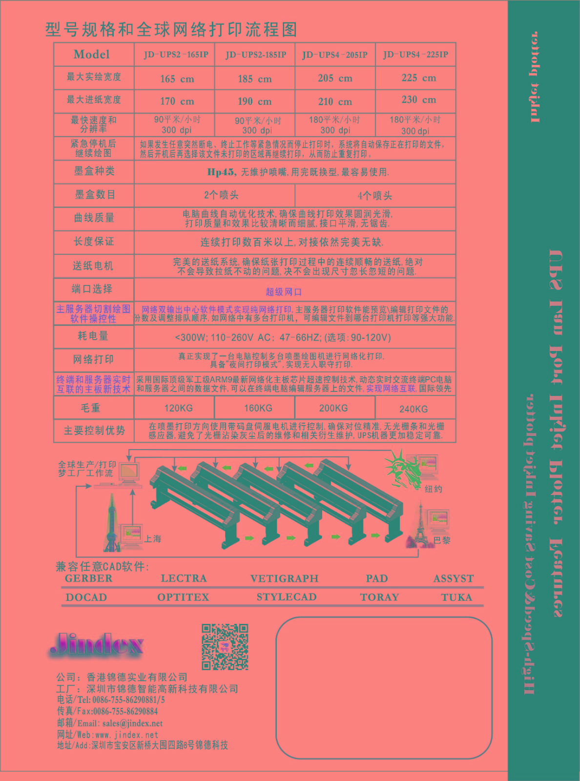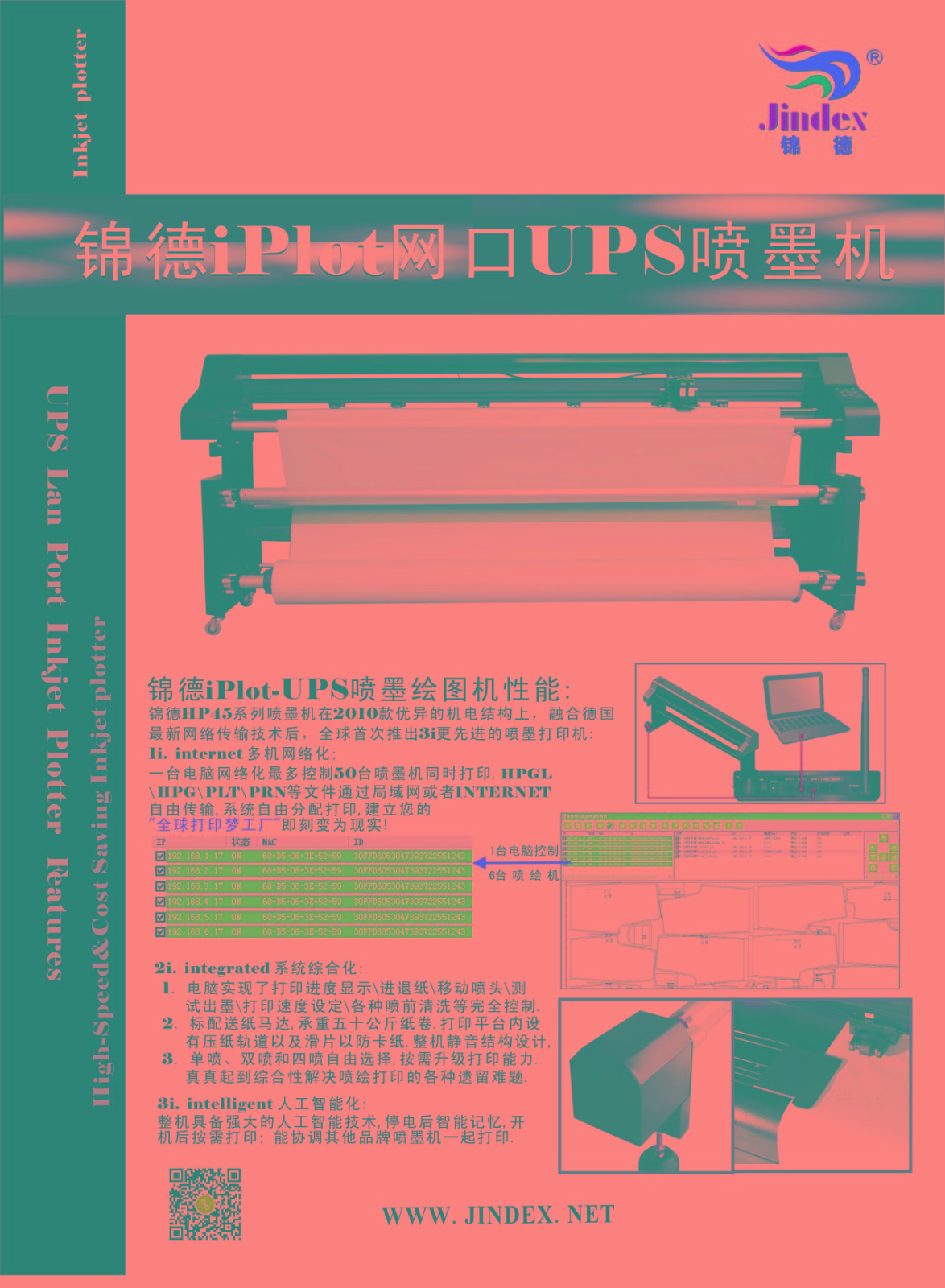 高速喷墨绘图仪打样效果清晰,性能稳定,精确度达到国际标准; 标准机型双喷墨,可升级4喷(比双喷速度快1.5倍) 全球首家前置双送纸系统